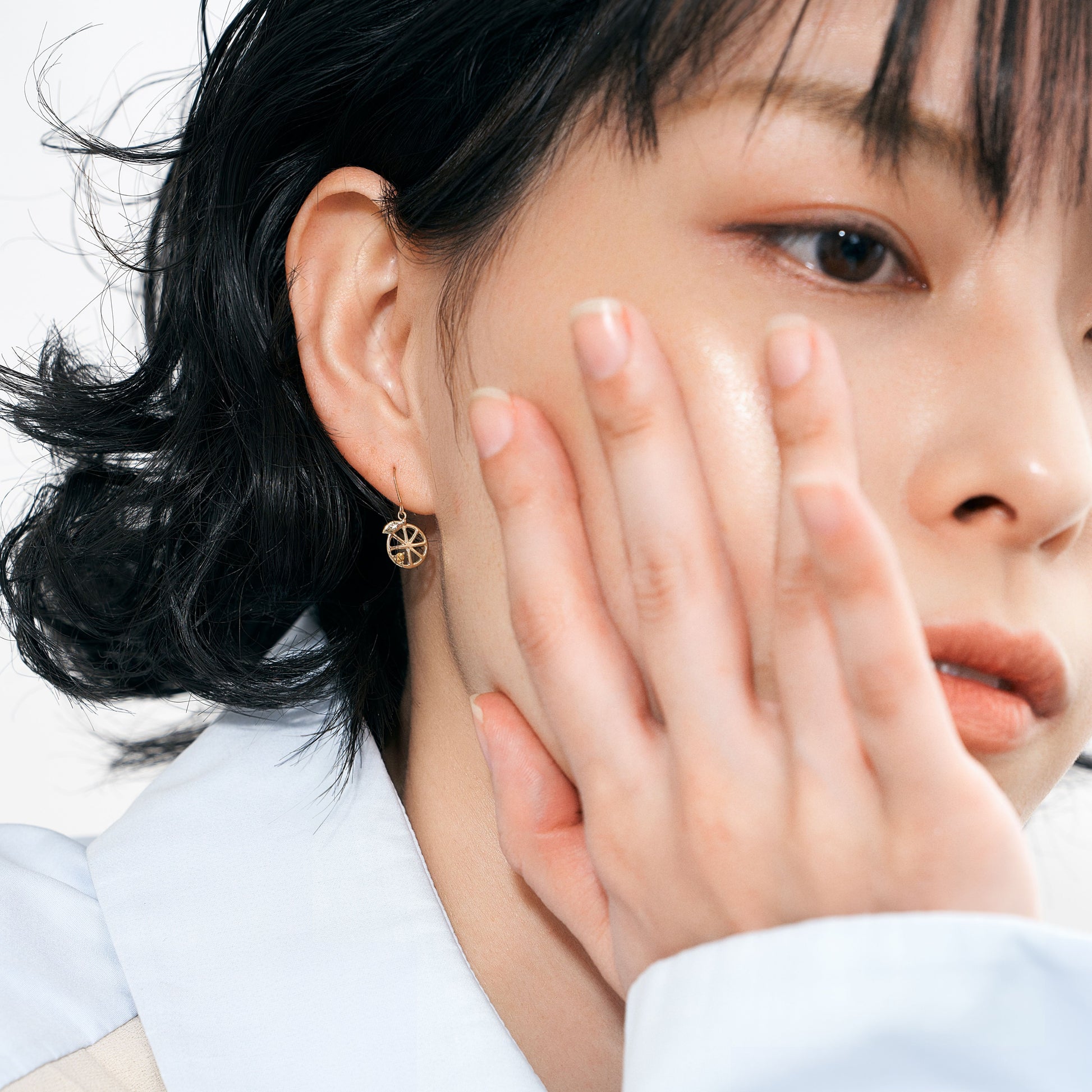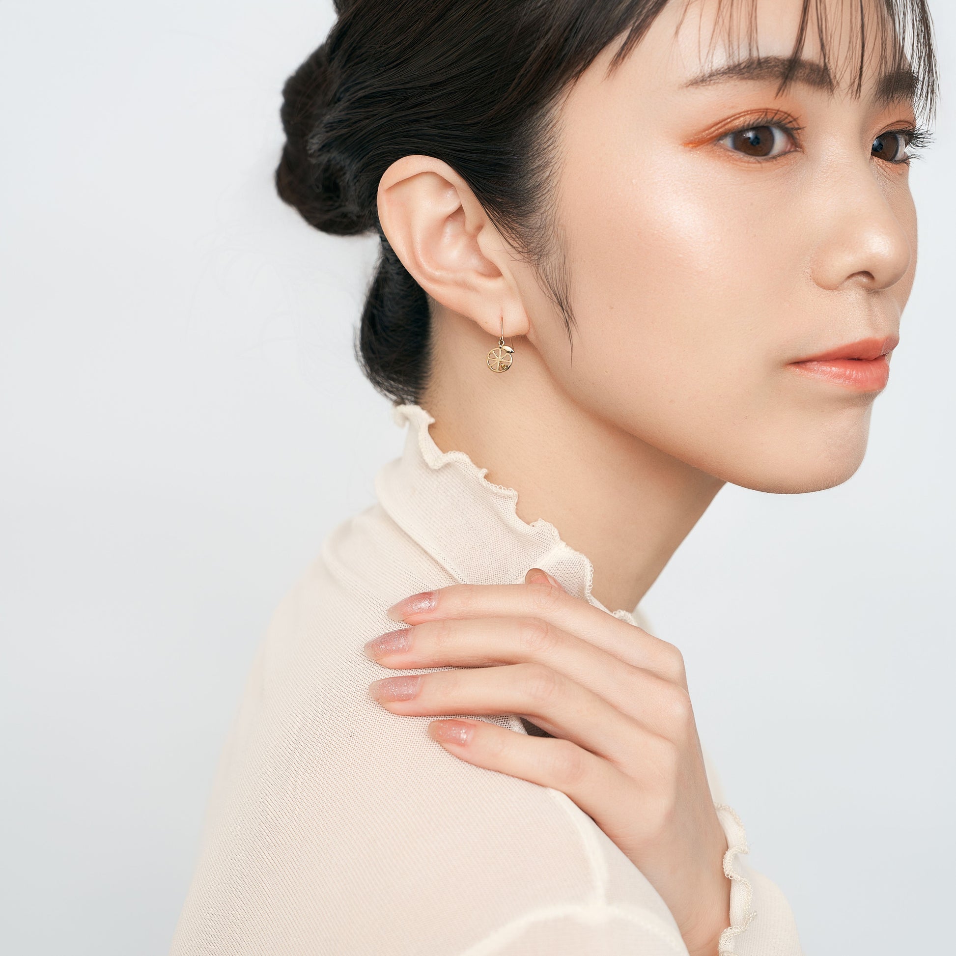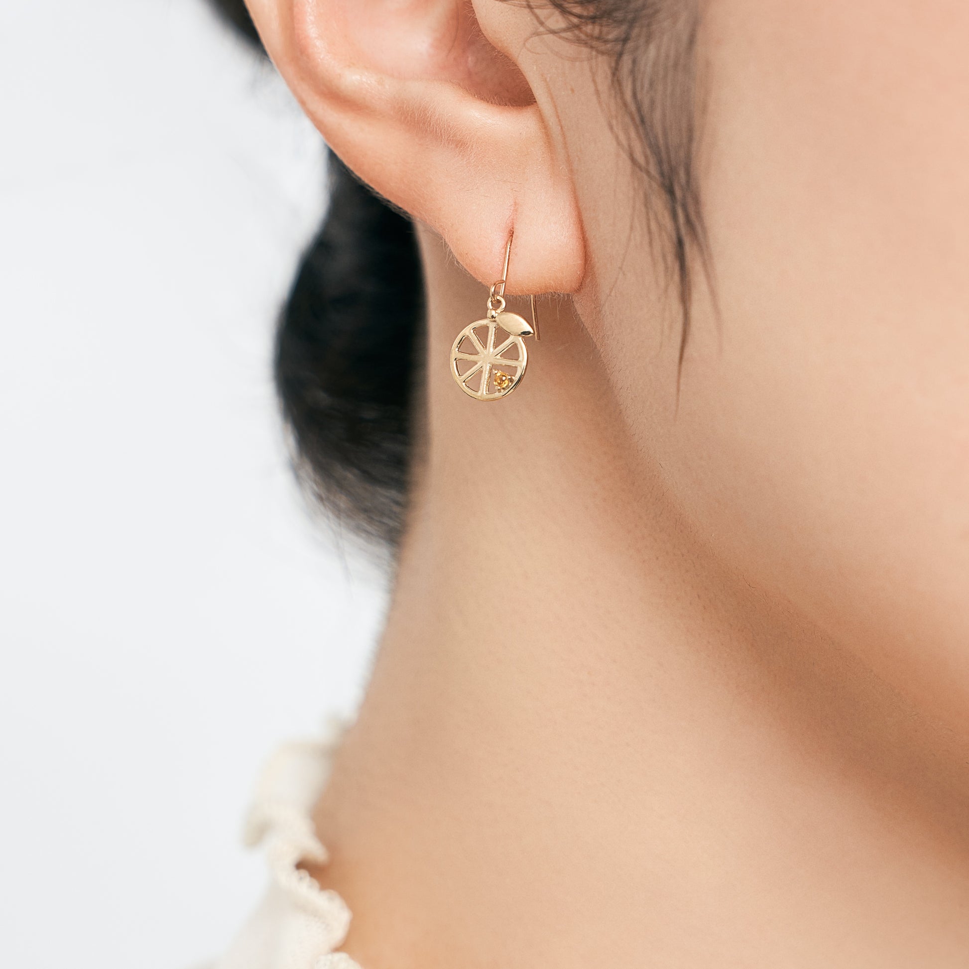 シンプルなラインで描いたフォルムに、果実のように色づく天然石を一粒あしらいました。軽やかな抜け感と上品な煌めきが、耳もとに可憐な彩りを添えます。