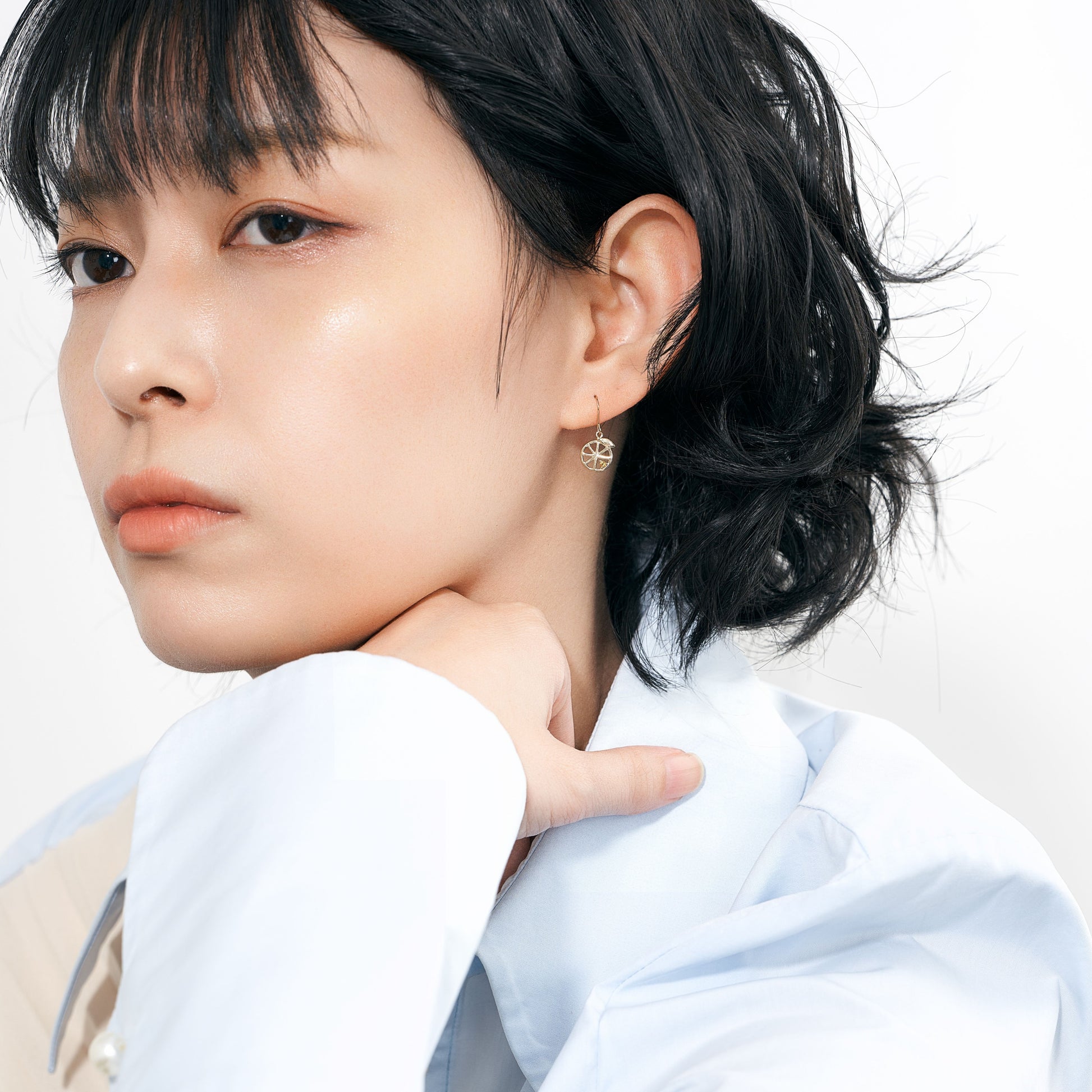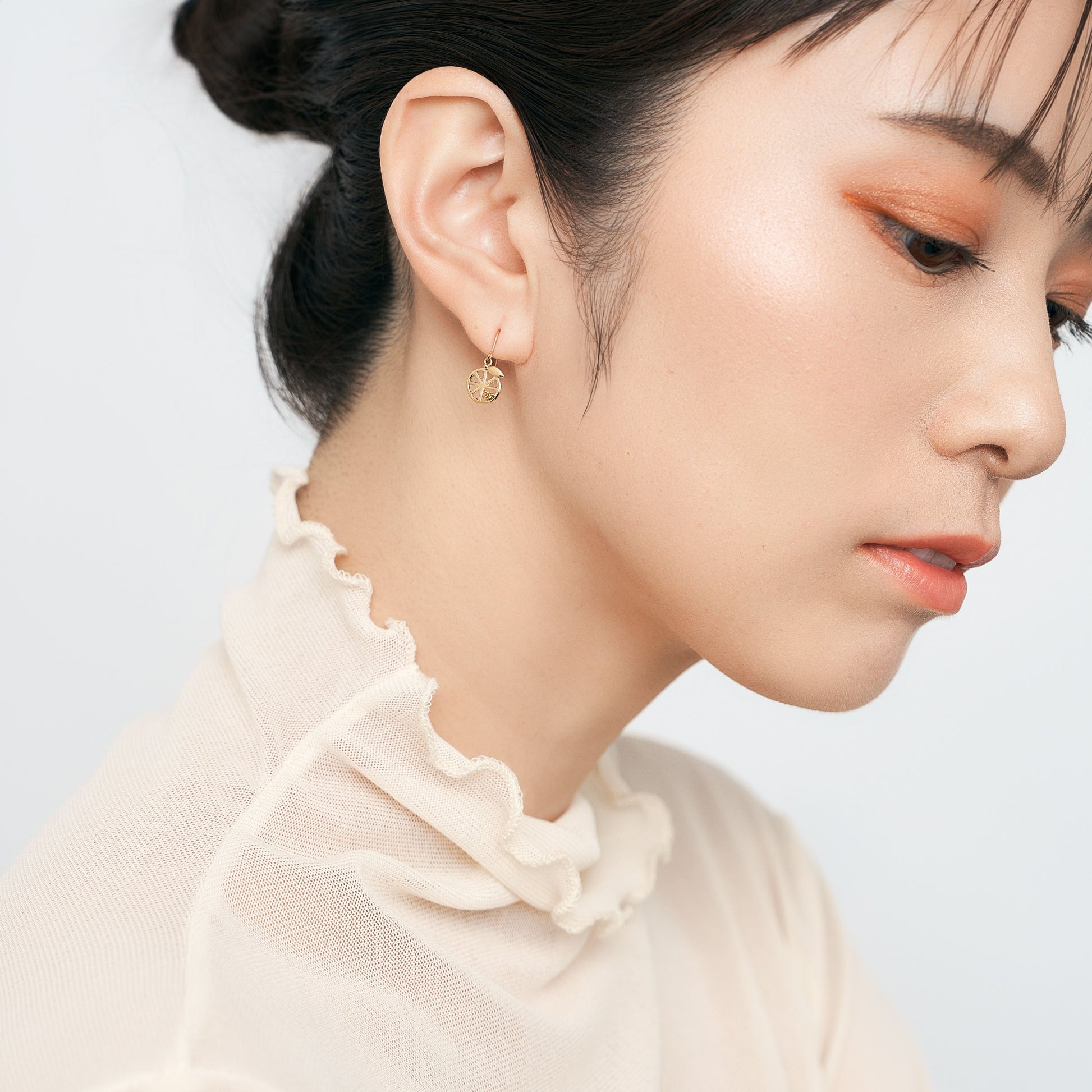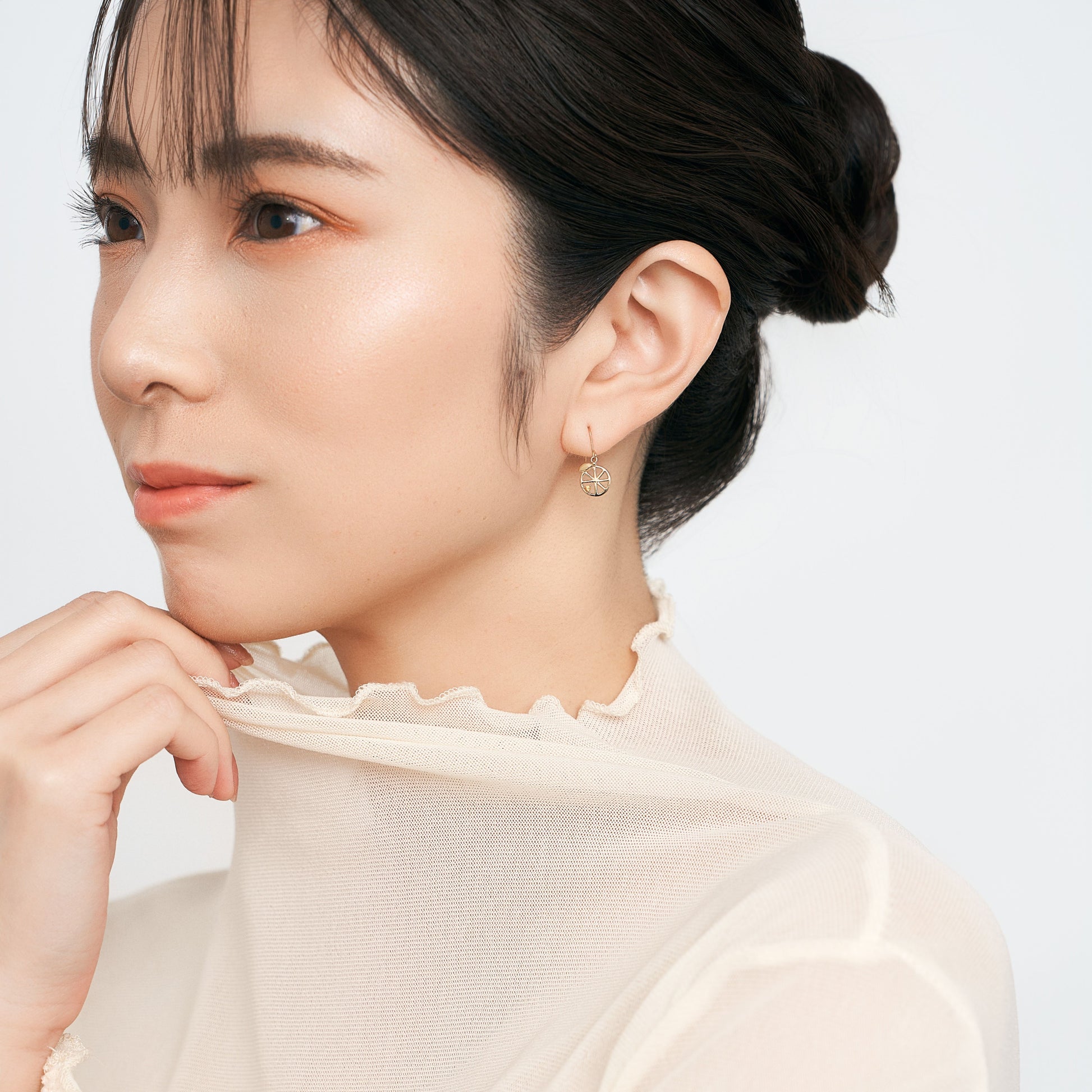 シンプルなラインで描いたフォルムに、果実のように色づく天然石を一粒あしらいました。軽やかな抜け感と上品な煌めきが、耳もとに可憐な彩りを添えます。