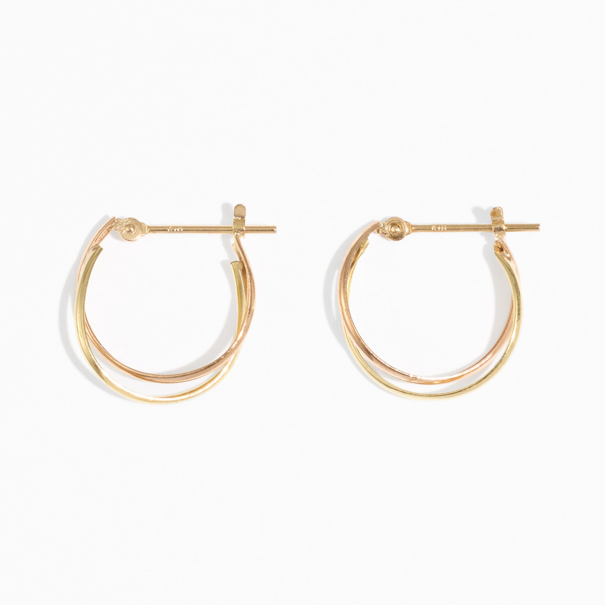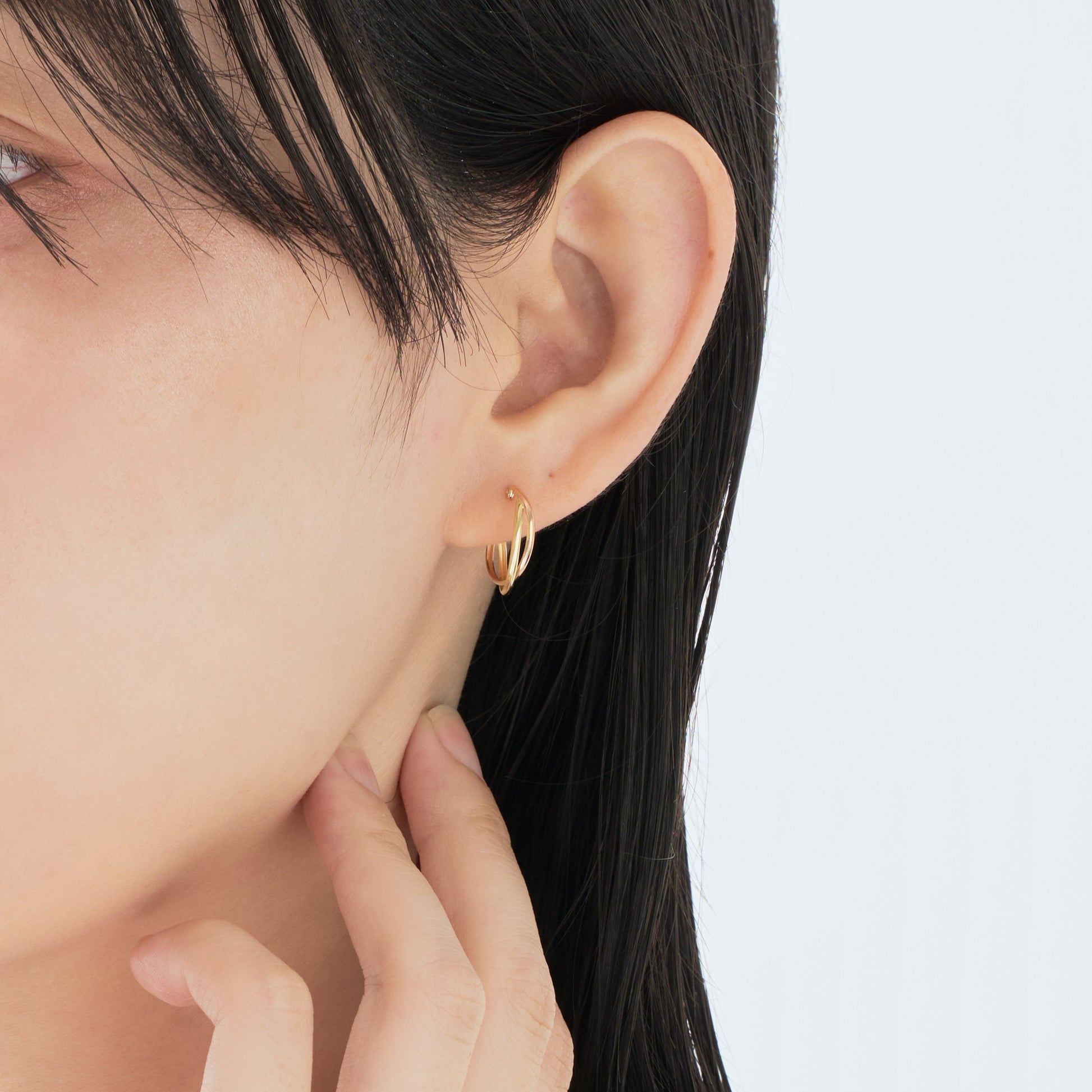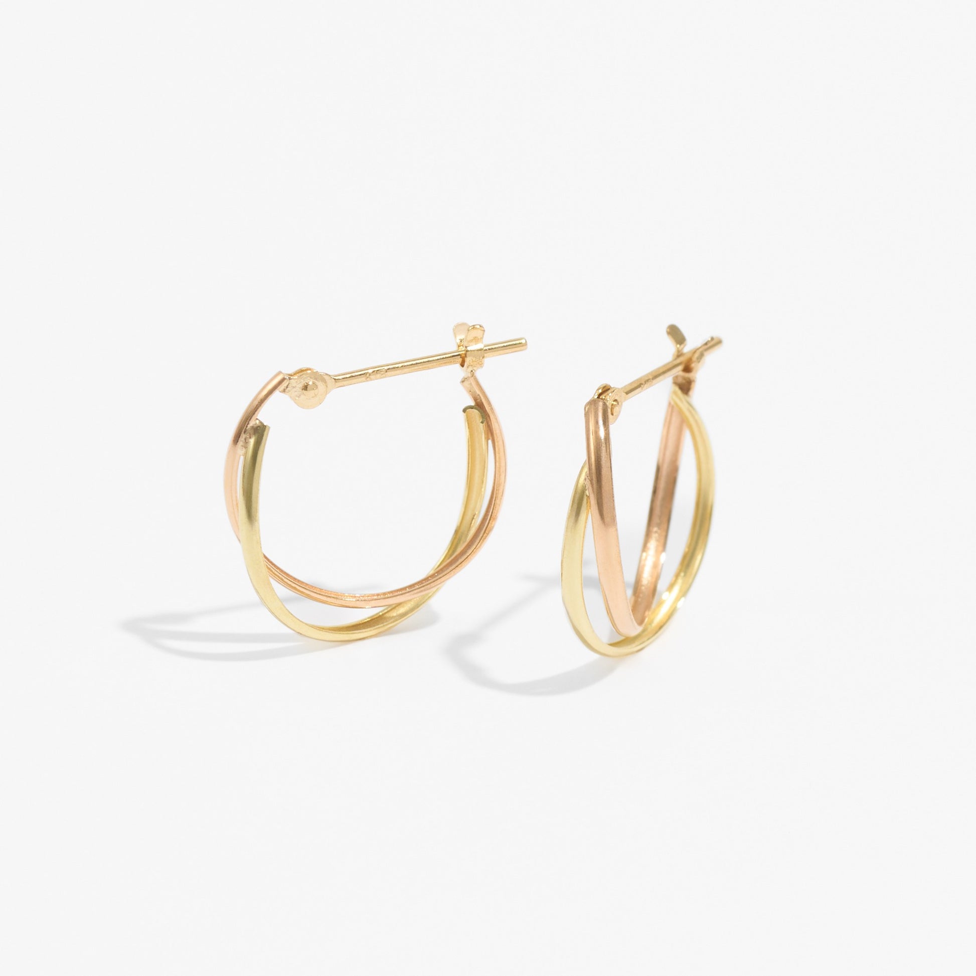 K18イエローゴールドの上品な輝きとK18ピンクゴールドの柔らかな色合いの2本のラインが交差するコンビカラーのフープピアス。