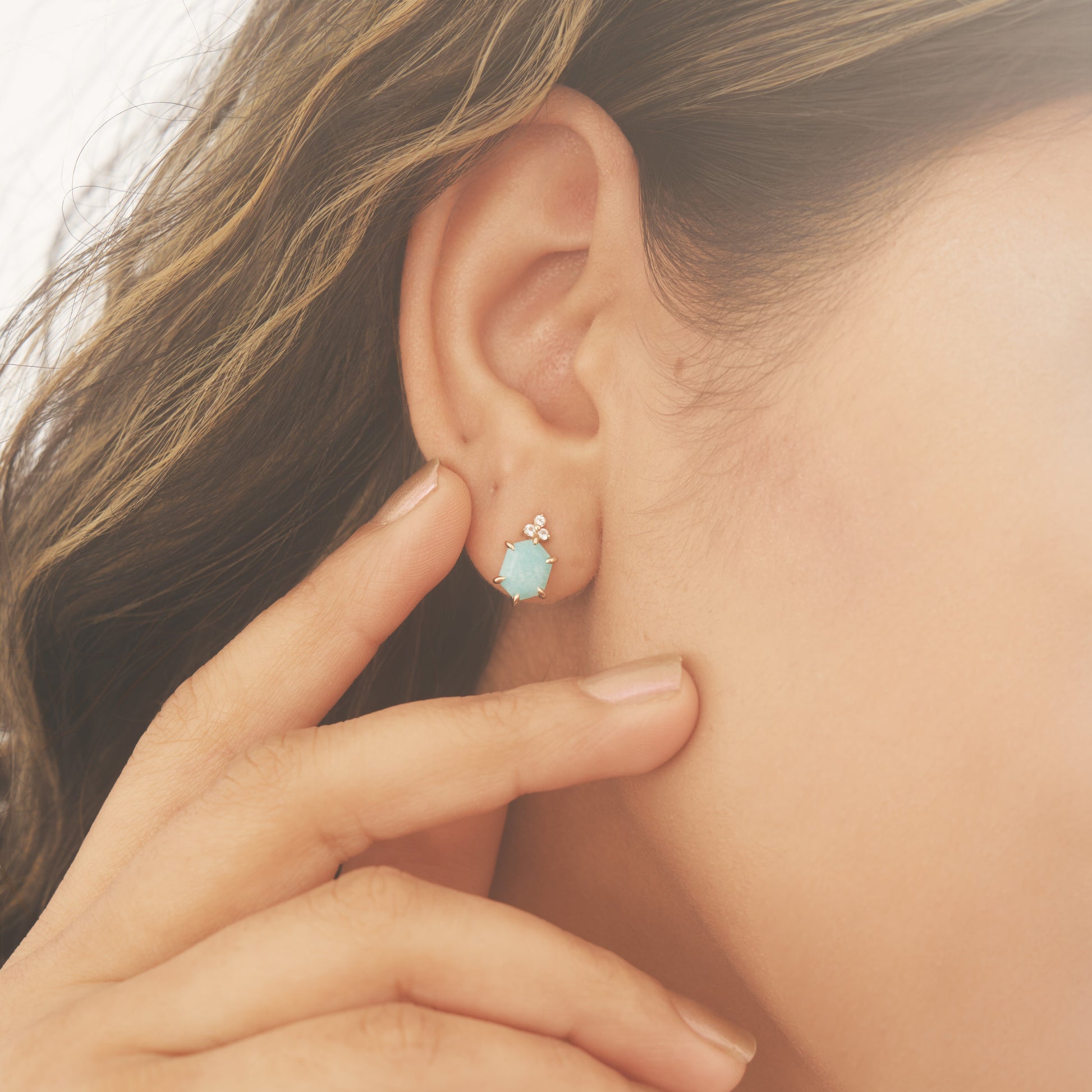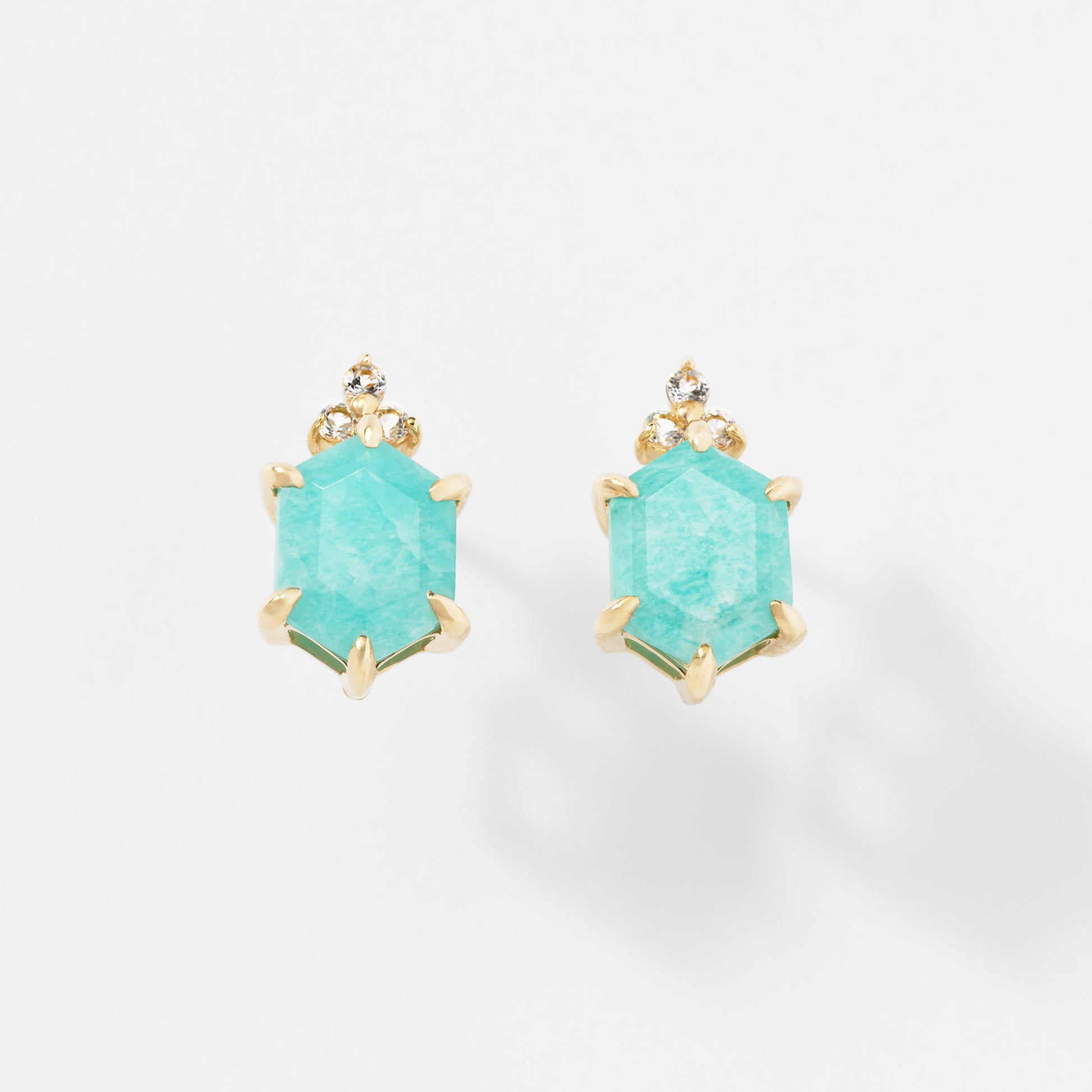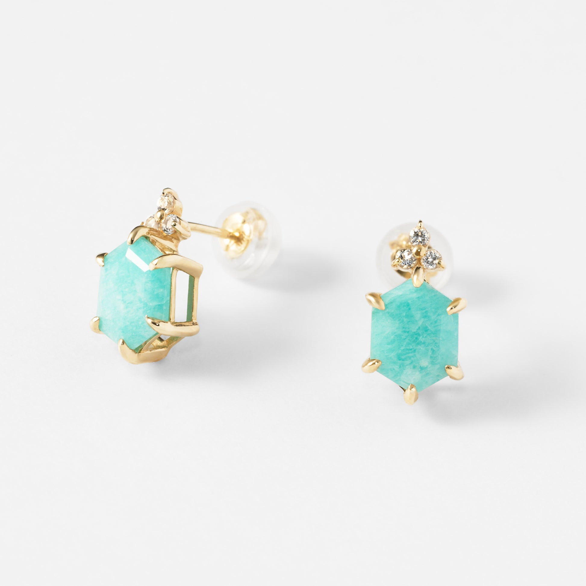 希望を象徴するアマゾナイトと、澄んだ気持ちへ導くホワイトトパーズ。「調和」や「安定」を象徴する六角形。天然石の持つ意味とフォルムが静かに響き合うデザインです。