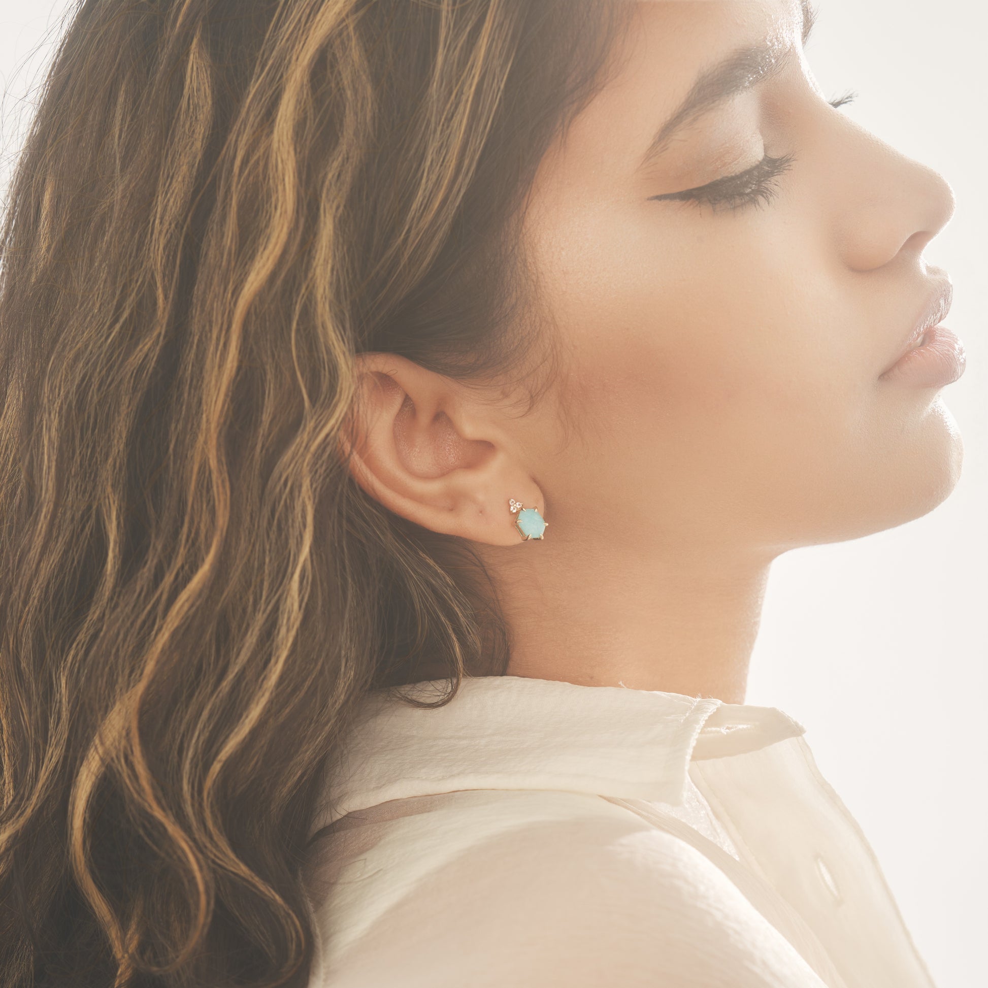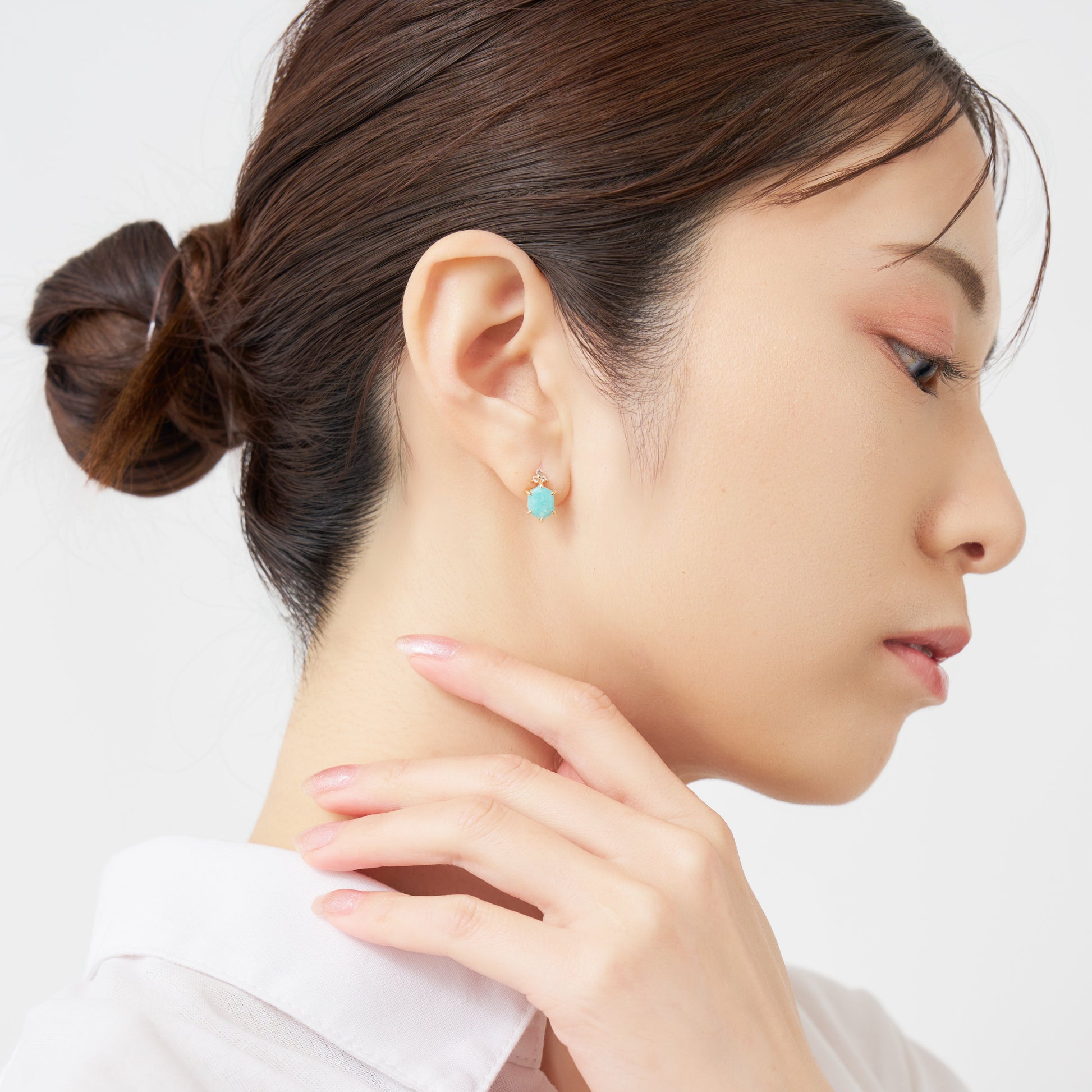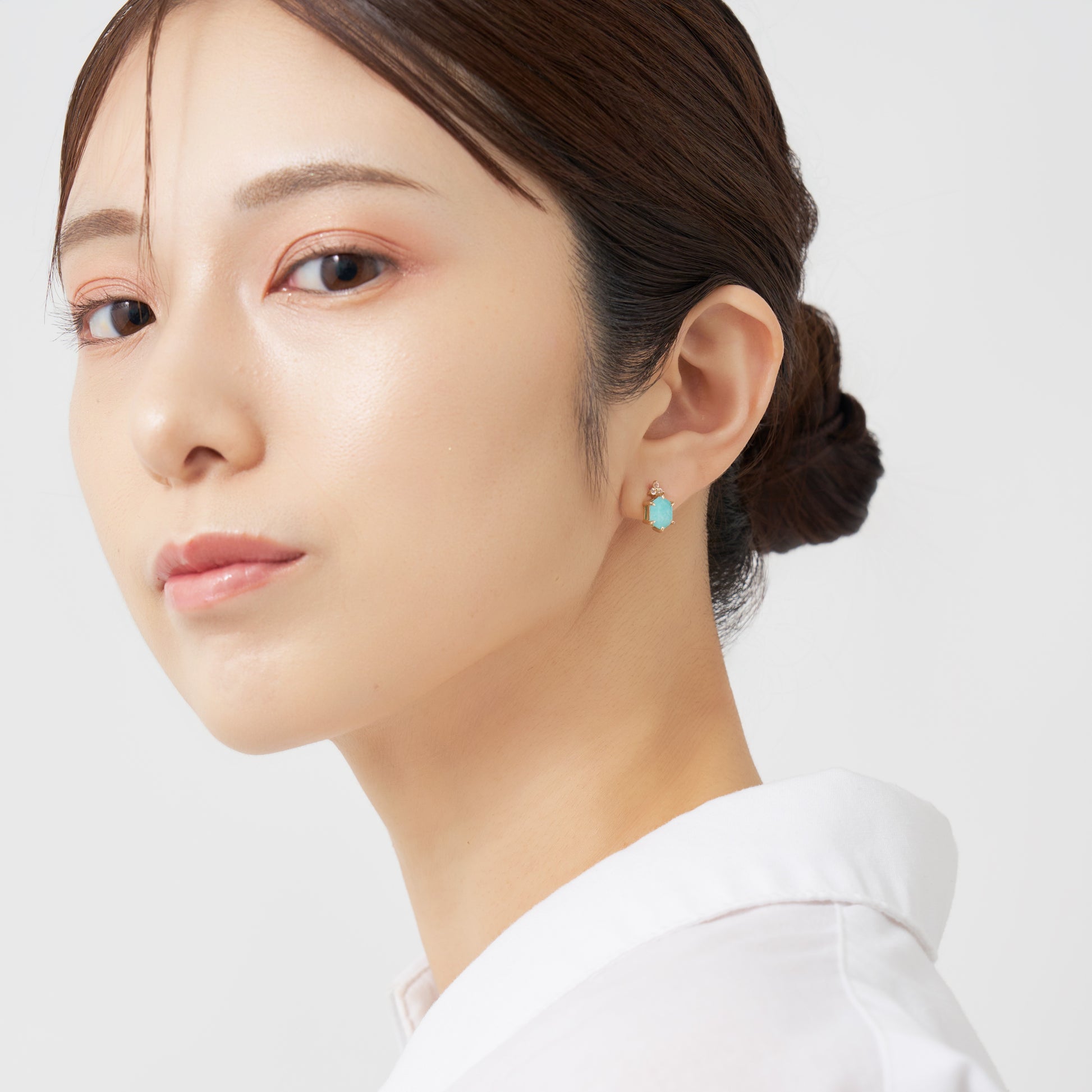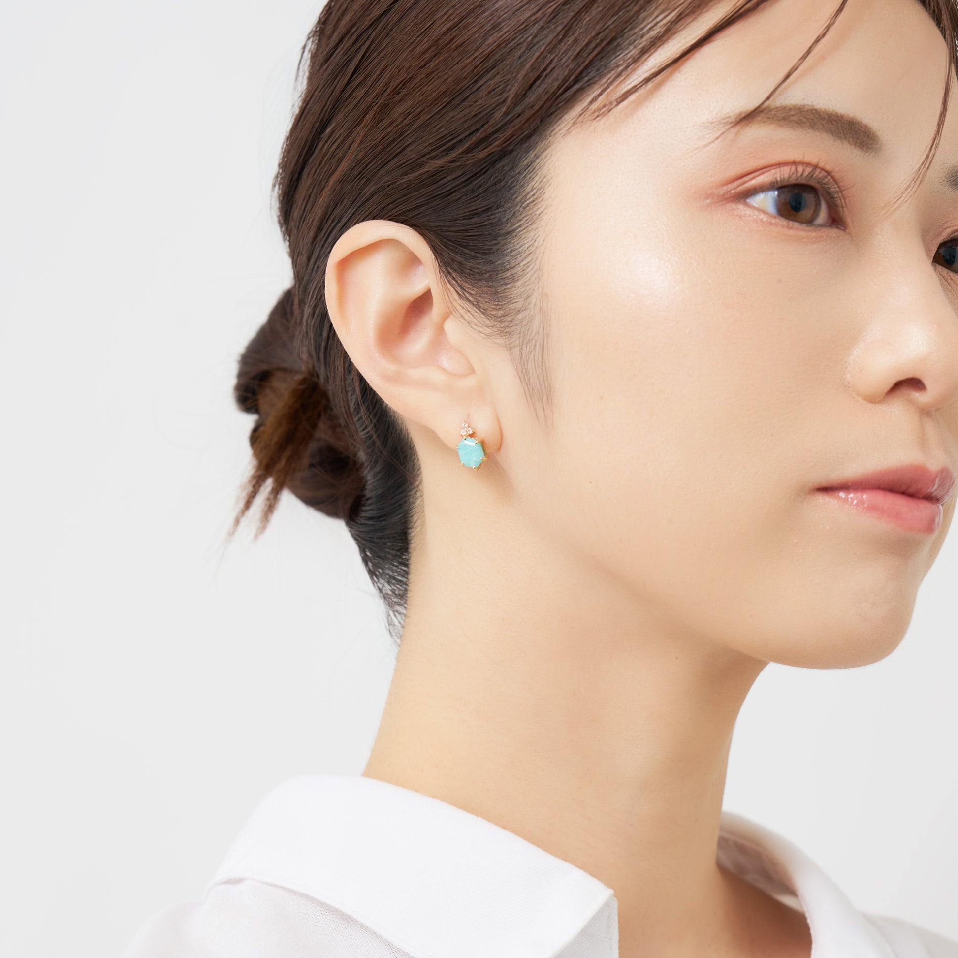 爽やかなブルーグリーンのアマゾナイトに、ホワイトトパーズの澄んだ輝きが重なり、耳元に凛とした透明感を添えます。