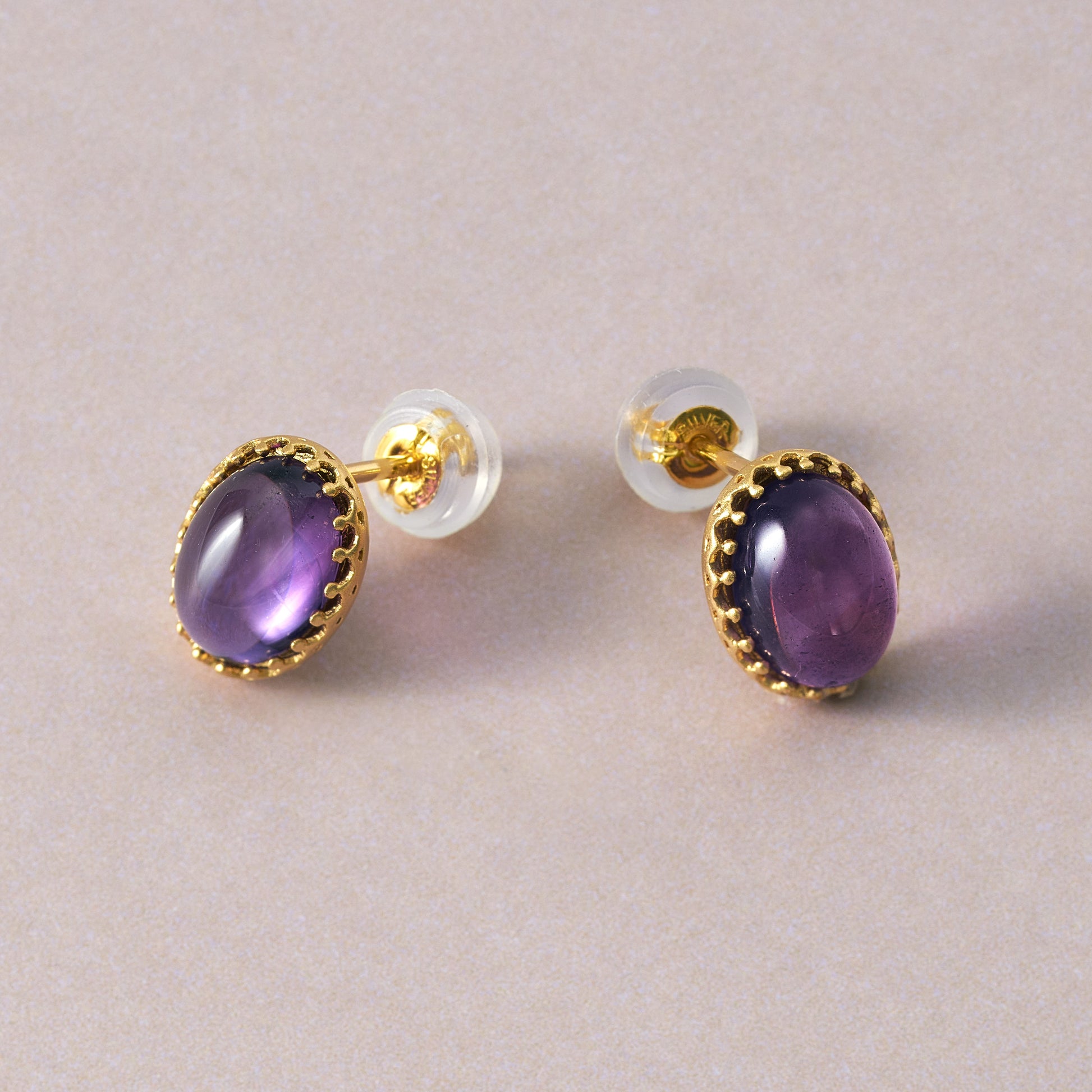 耳元で深紫のアメジストが穏やかに輝くピアス。