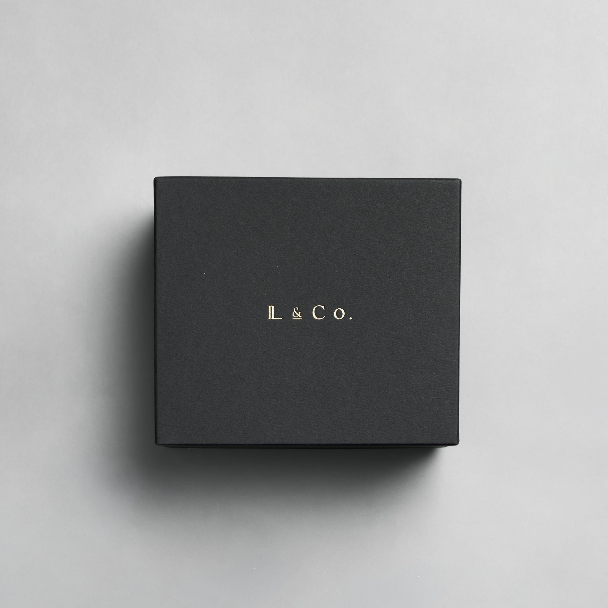 深みのあるブラックにL&Co.のゴールドロゴが煌めくギフトボックスと